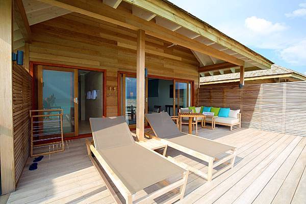Ocean villa內嘅裝飾簡潔舒適,富現代感之餘亦同出面嘅印度洋互相輝映,露台有餐枱丶L形梳化同太陽椅,私人泳池都唔細,旁邊就係俾我哋落潟湖嘅樓梯。