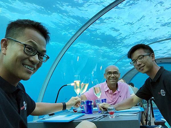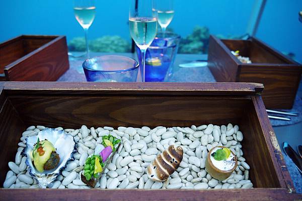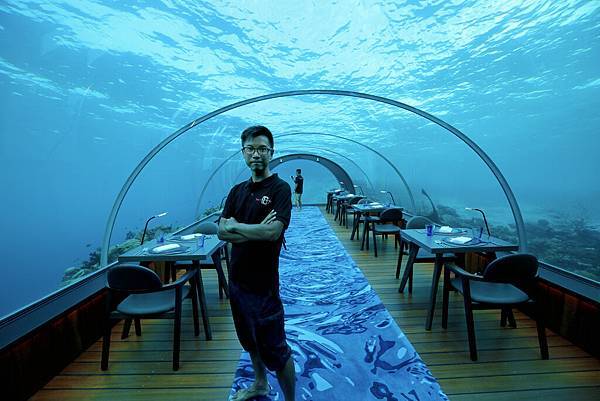 落到去,感覺非常震撼,大魚細魚喺我哋四方八面游嚟游去, 目不暇給!除咗海底世界令人感覺新奇,餐廳提供嘅佳餚美饌也令人回味無窮!德國大廚曾經喺三間米芝蓮餐廳工作,四個course及七個course嘅午餐分別US190及US280,而晚餐都是七個course,US280。咁食午餐定食晚餐會見到多D魚呢?其實都冇一定嘅,不過唔好以為夜晚個海會黑漆漆乜都睇唔到,晚餐時段由6:15pm開始,呢個時候仲有日照,可以欣賞到日間海底世界;7pm開始日落,日照漸少直至變成黑漆漆,海底大燈就會開著引D魚過嚟⋯⋯所以食晚餐就可以同時欣賞日同夜嘅海底,貴得有道理㗎!而且餐廳係fine dining,每道菜都相隔20-25分鐘,等食客有足夠時間慢慢品嚐👍🏻